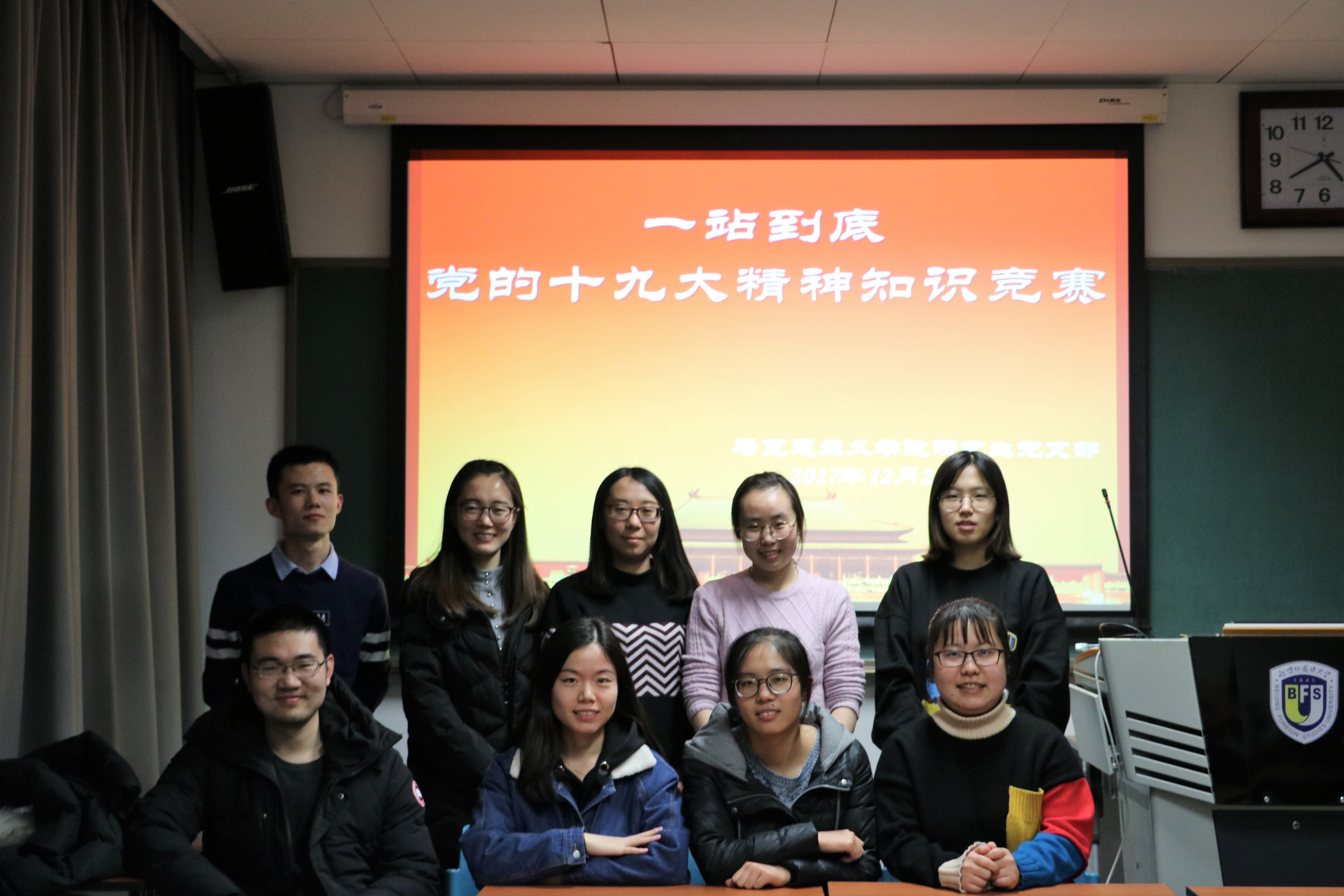 本次知识竞赛以中国共产党的基本理论、十九大报告、以及十九大后形成的党的最新理论成果为内容,通过一站到底式的竞答方式,以淘汰制的赛制,吸引了各位同学的积极踊跃的参与,每一个人在竞答过程中尽其所能,使得整个比赛过程既具娱乐性,也具有很强的学习性。每个人在答题过程中加深了对中国共产党的了解和对十九大精神的领悟。经过激烈的角逐,于慧、付豪、王琼分别获得了一等奖、二等奖和三等奖。